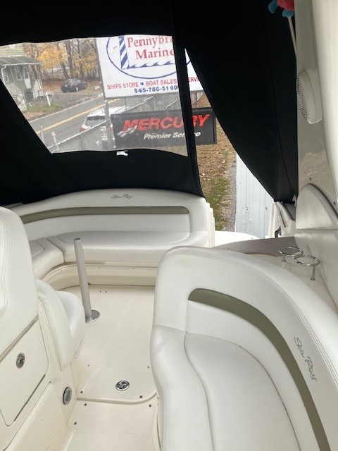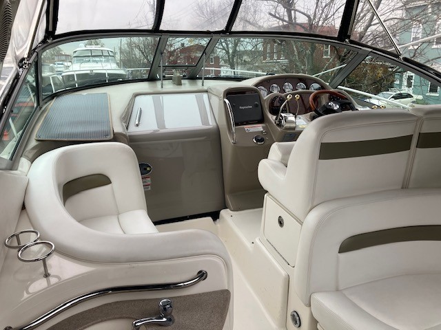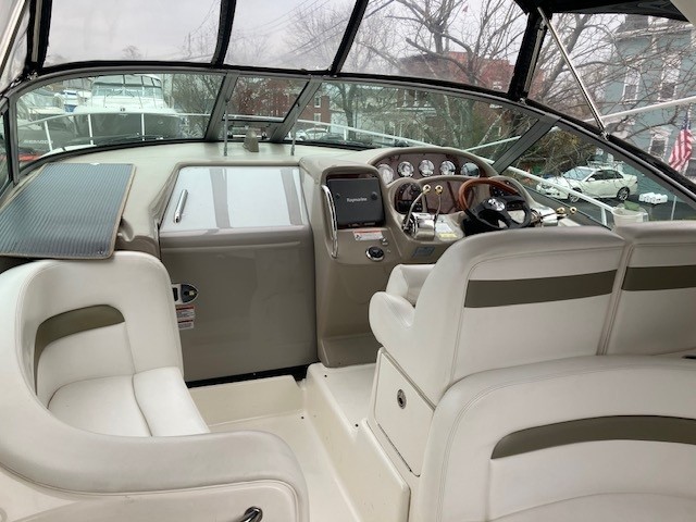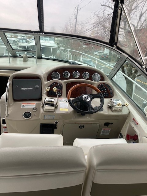 This 2007 Sea Ray 320 Sundancer is a very clean, well equipped boat with only 325 hours on the Mercruiser 350 magnum v-drive inboards. The current owner has replaced props, shafts, and rudders. Recently sea water pumps, impellers and pulleys have been replaced as well. Listed exclusively with PennyBridge Marine this 320 is fully equipped with all standard equipment and Raymarine radar and GPS. All interior and exterior vinyl were well maintained and in excellent condition.